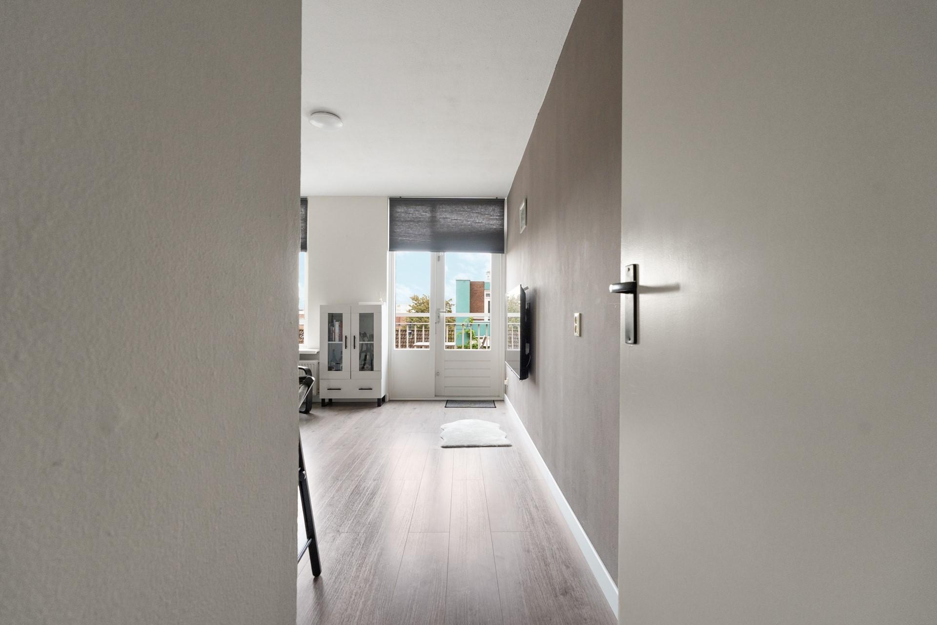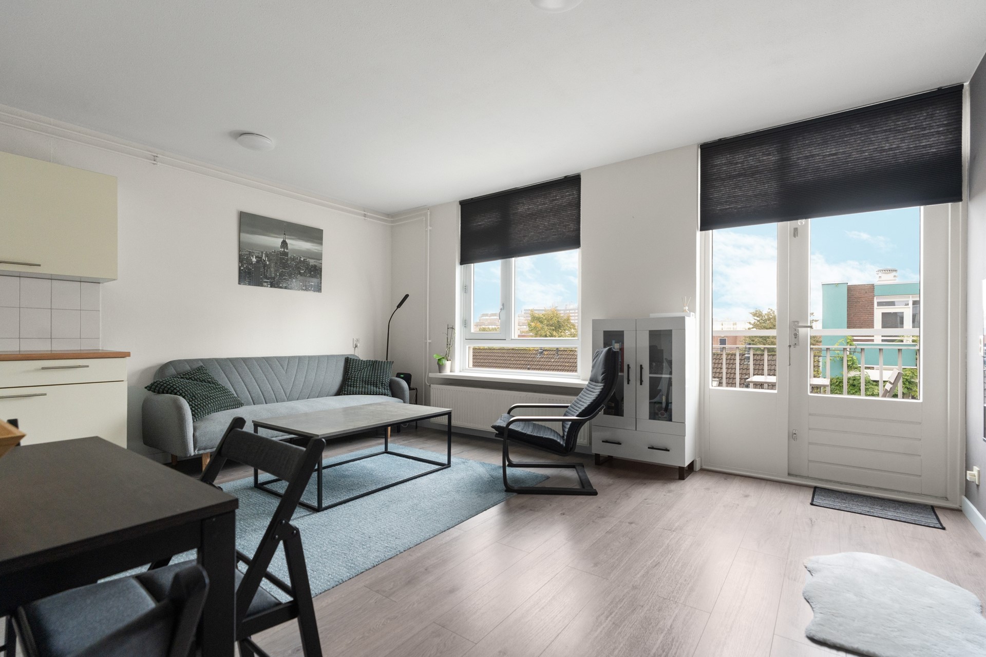 Entree, hal met meterkast, slaapkamer, modern gerenoveerde badkamer met toilet, wastafel, wasmachine-aansluiting en douchehoek. Ruime zeer lichte woonkamer met open keuken. Vanuit de woonkamer heb je toegang tot het op het oosten gelegen balkon.