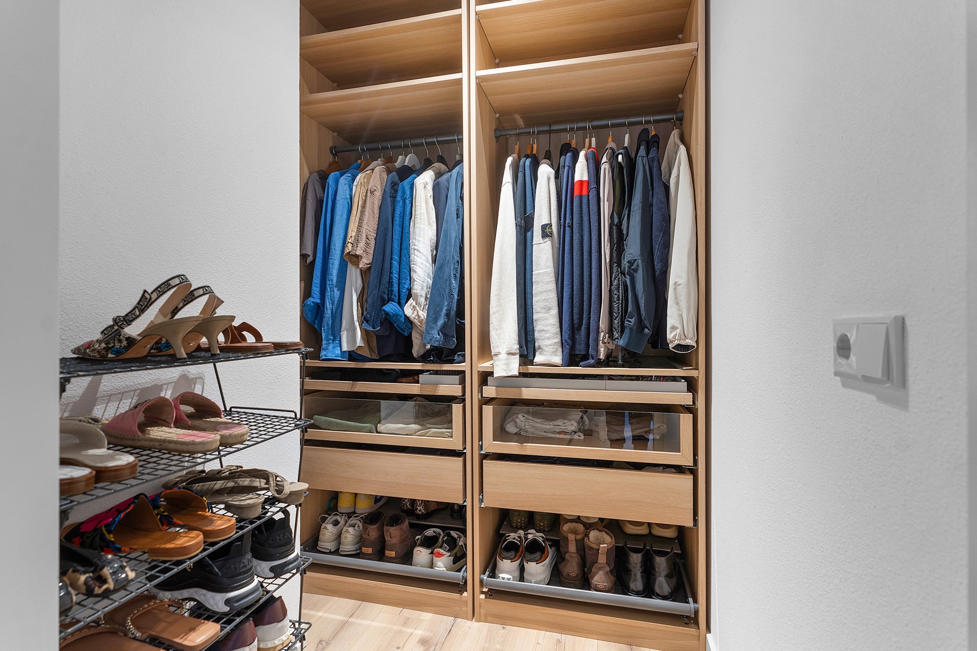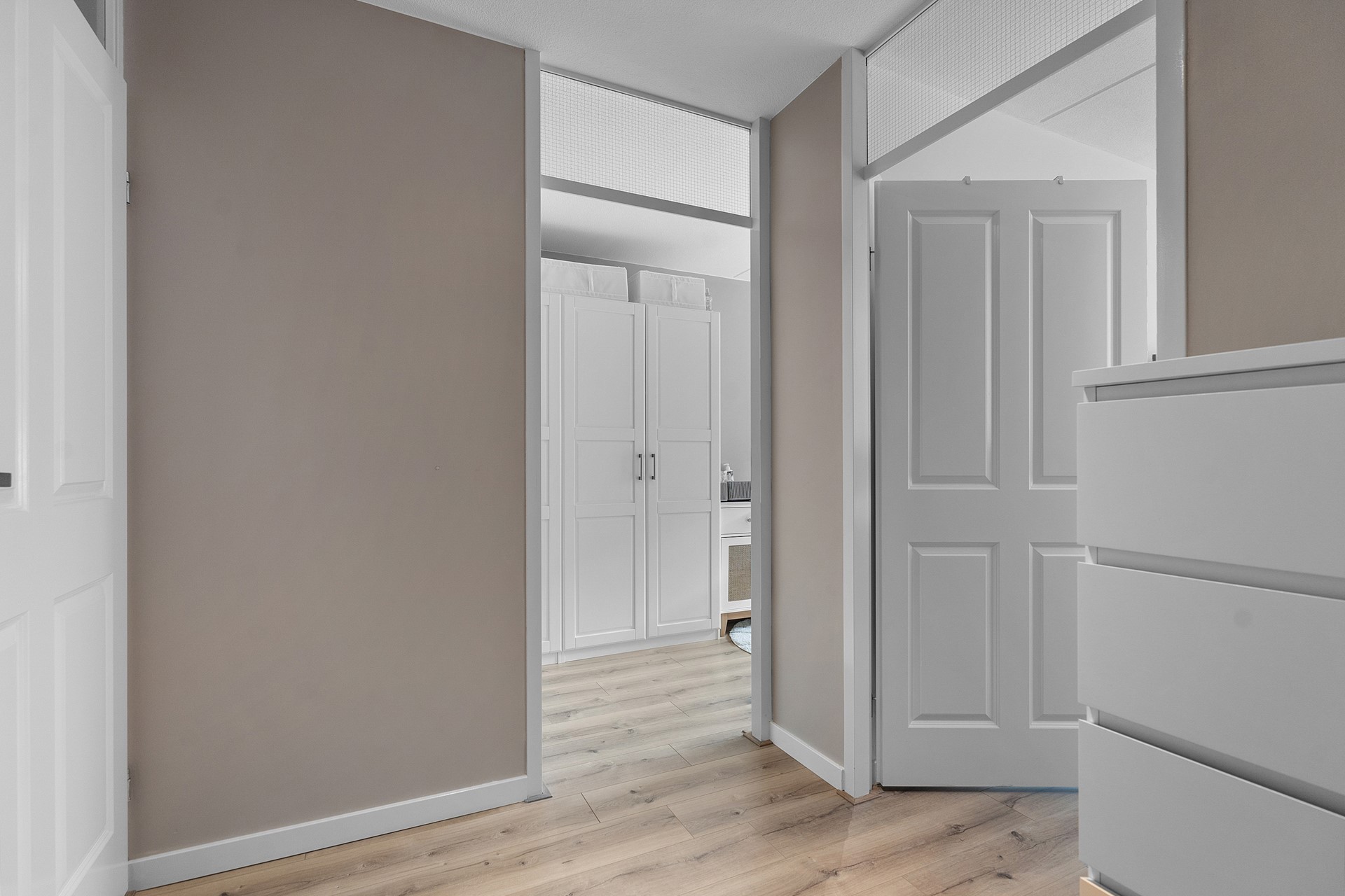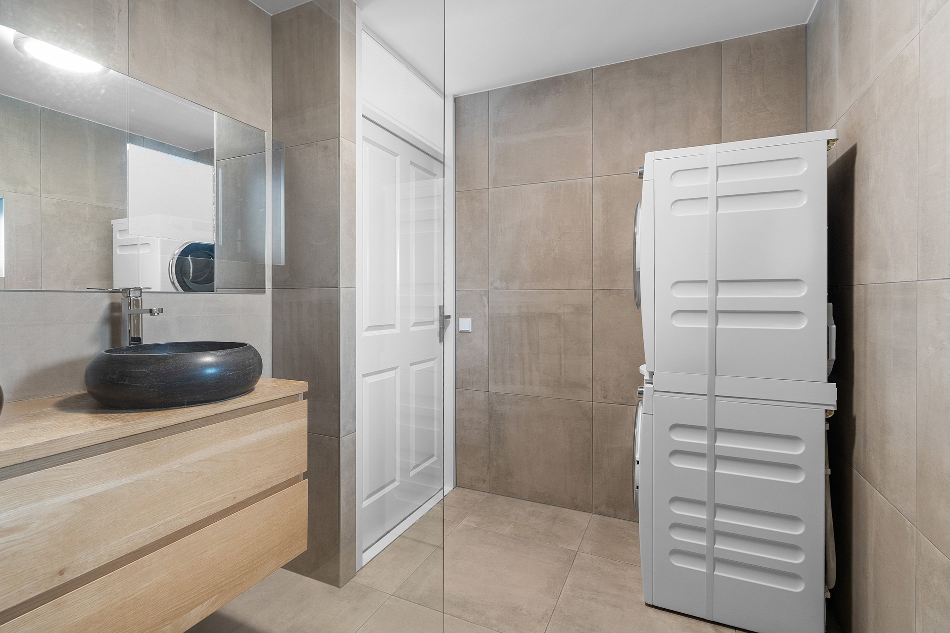 Overloop met toegang tot twee royale slaapkamers, waarvan één met schuifpui naar het zonnige balkon (loggia). De moderne badkamer beschikt over een ruime inloopdouche, dubbele wastafel en een wasmachine-/drogeropstelling. Daarnaast is er een handige inpandige berging, ideaal als inloopkast of extra opslagruimte.