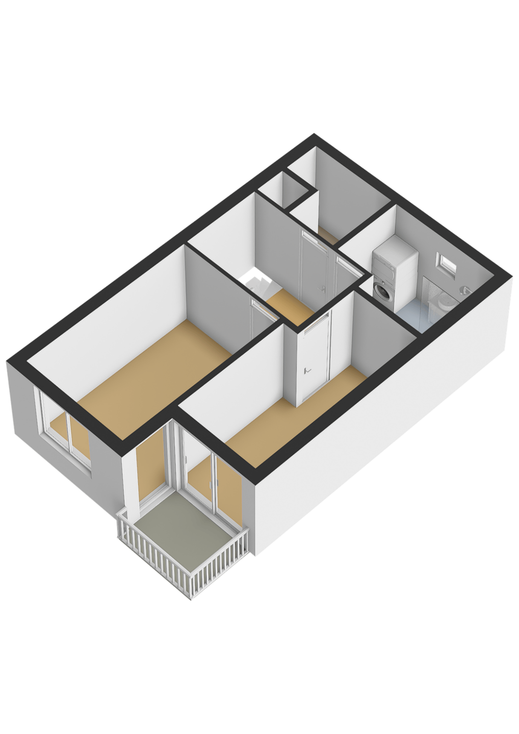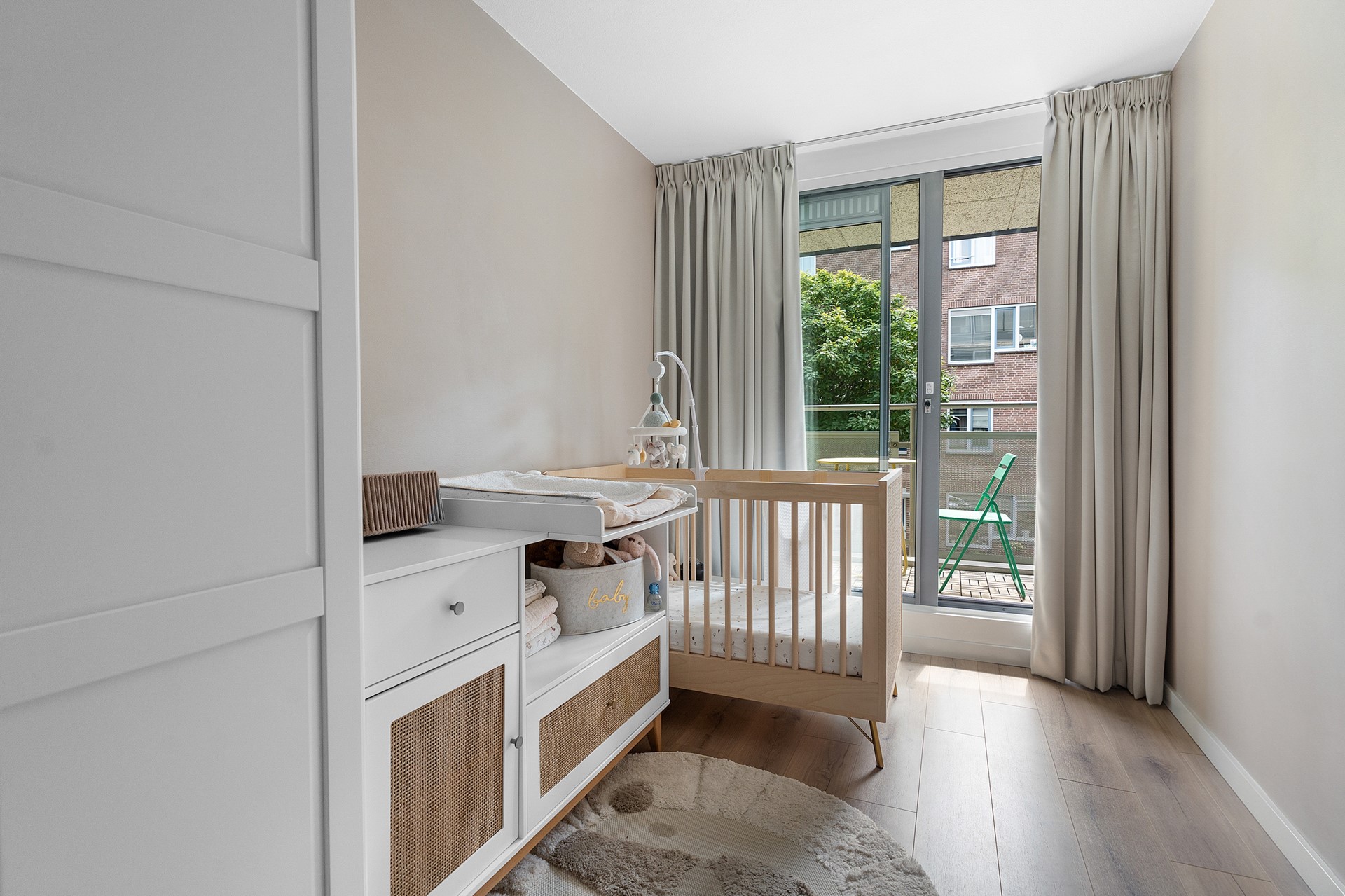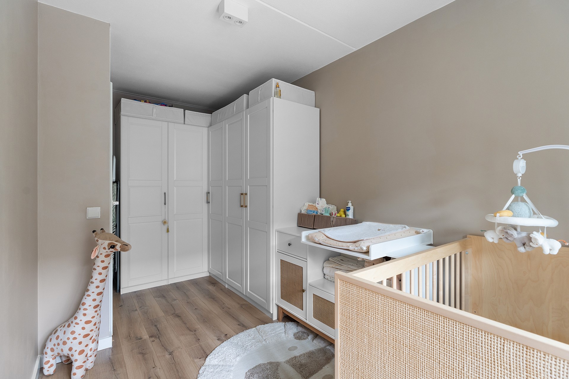 Overloop met toegang tot twee royale slaapkamers, waarvan één met schuifpui naar het zonnige balkon (loggia). De moderne badkamer beschikt over een ruime inloopdouche, dubbele wastafel en een wasmachine-/drogeropstelling. Daarnaast is er een handige inpandige berging, ideaal als inloopkast of extra opslagruimte.