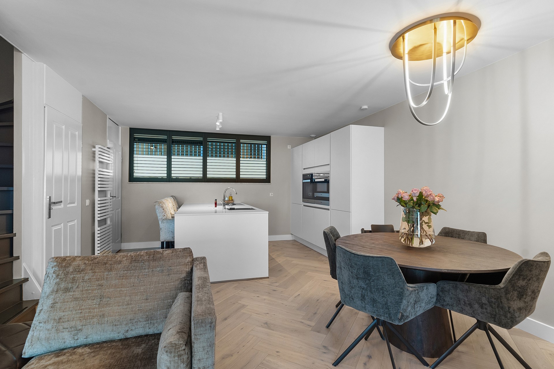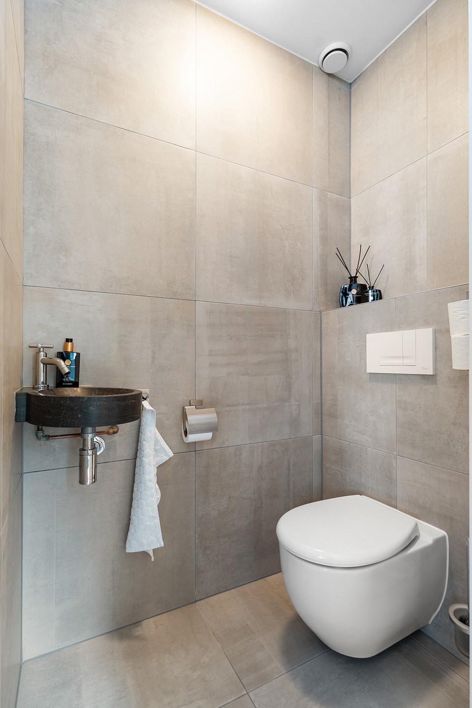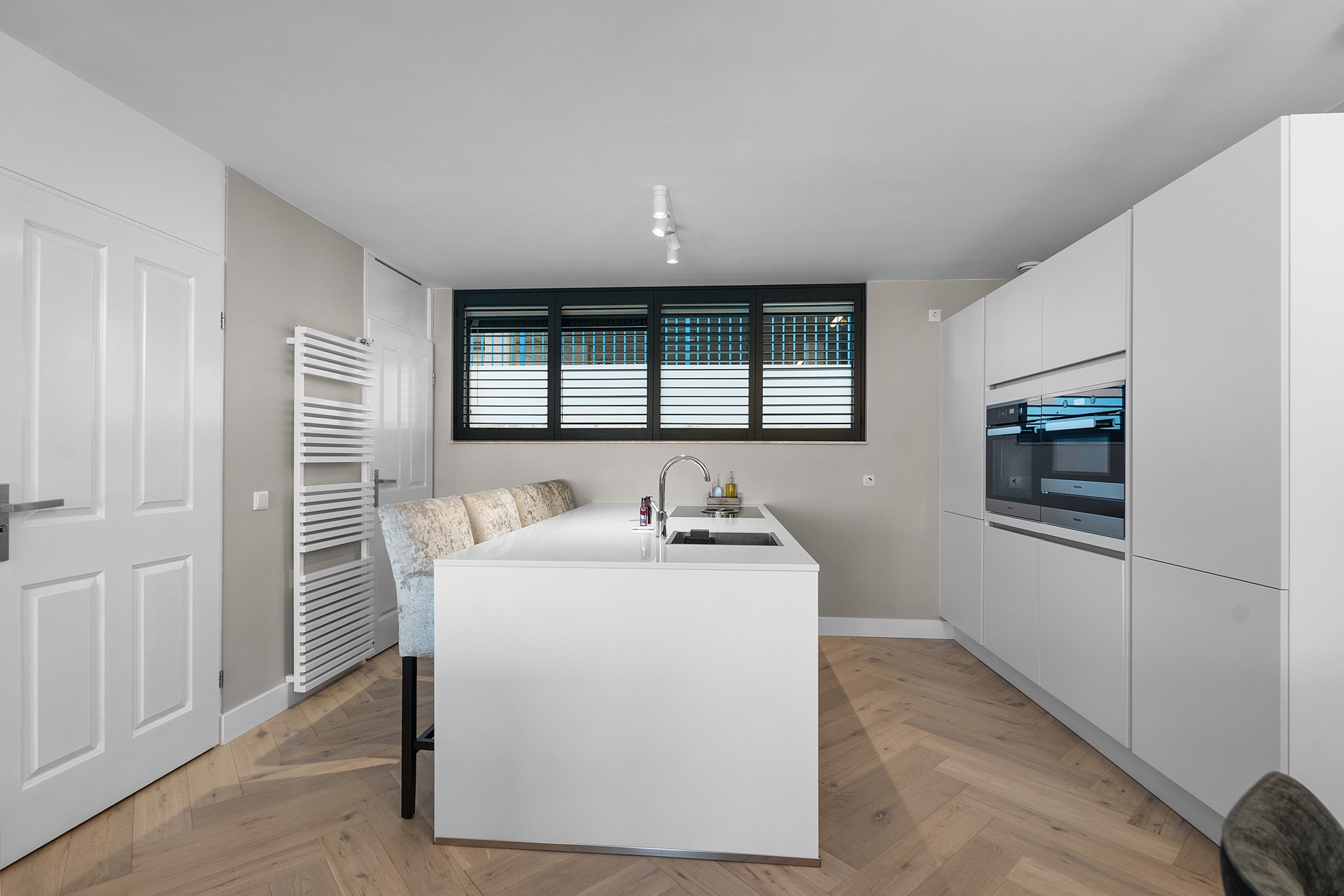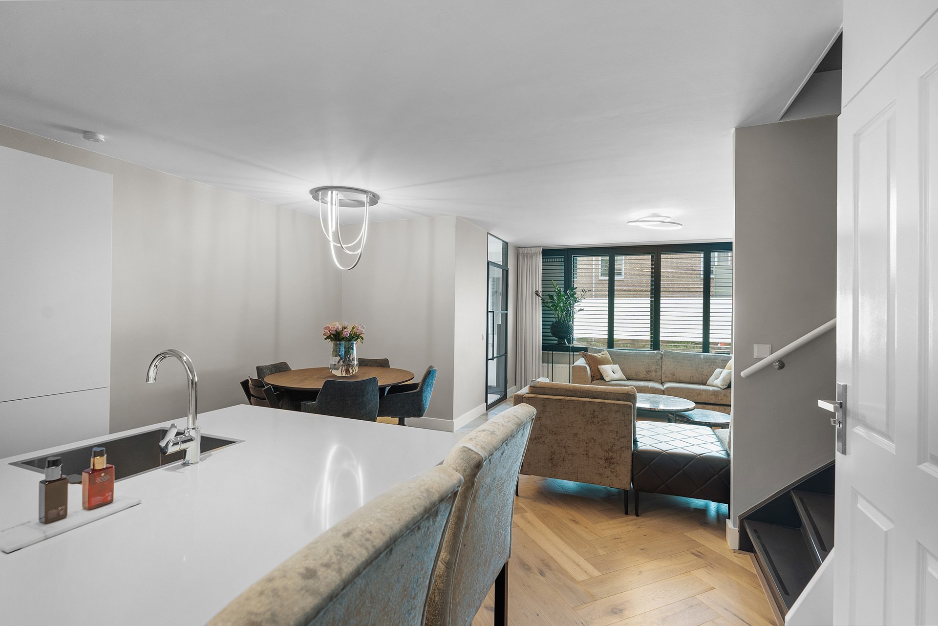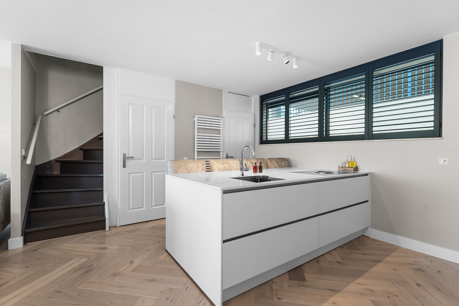 Entree, hal met modern wandcloset en fonteintje. Ruime woonkamer met grote ramen en veel lichtinval, voorzien van stijlvolle shutters. Open keuken (2019) in moderne opstelling, uitgerust met luxe inbouwapparatuur.