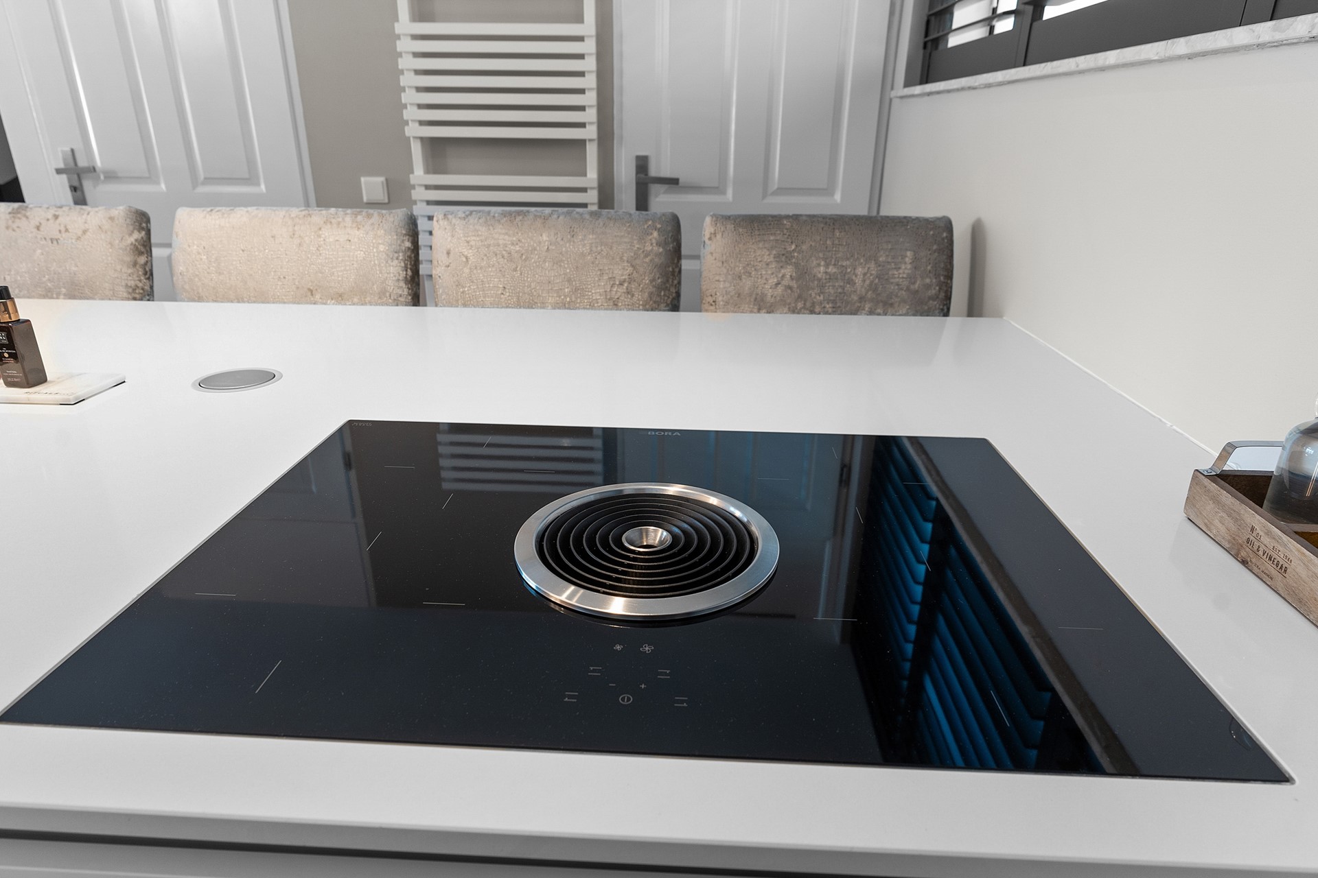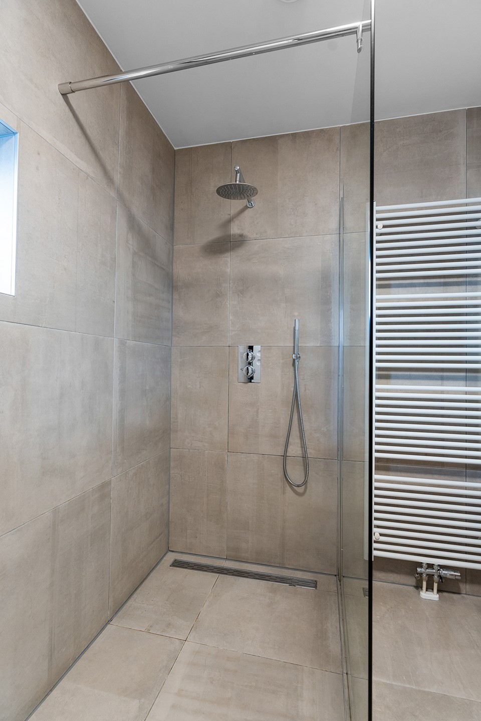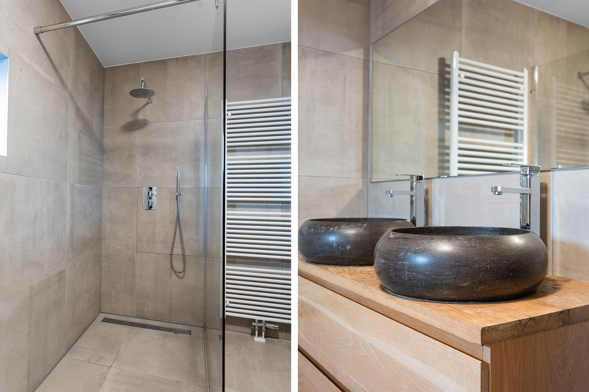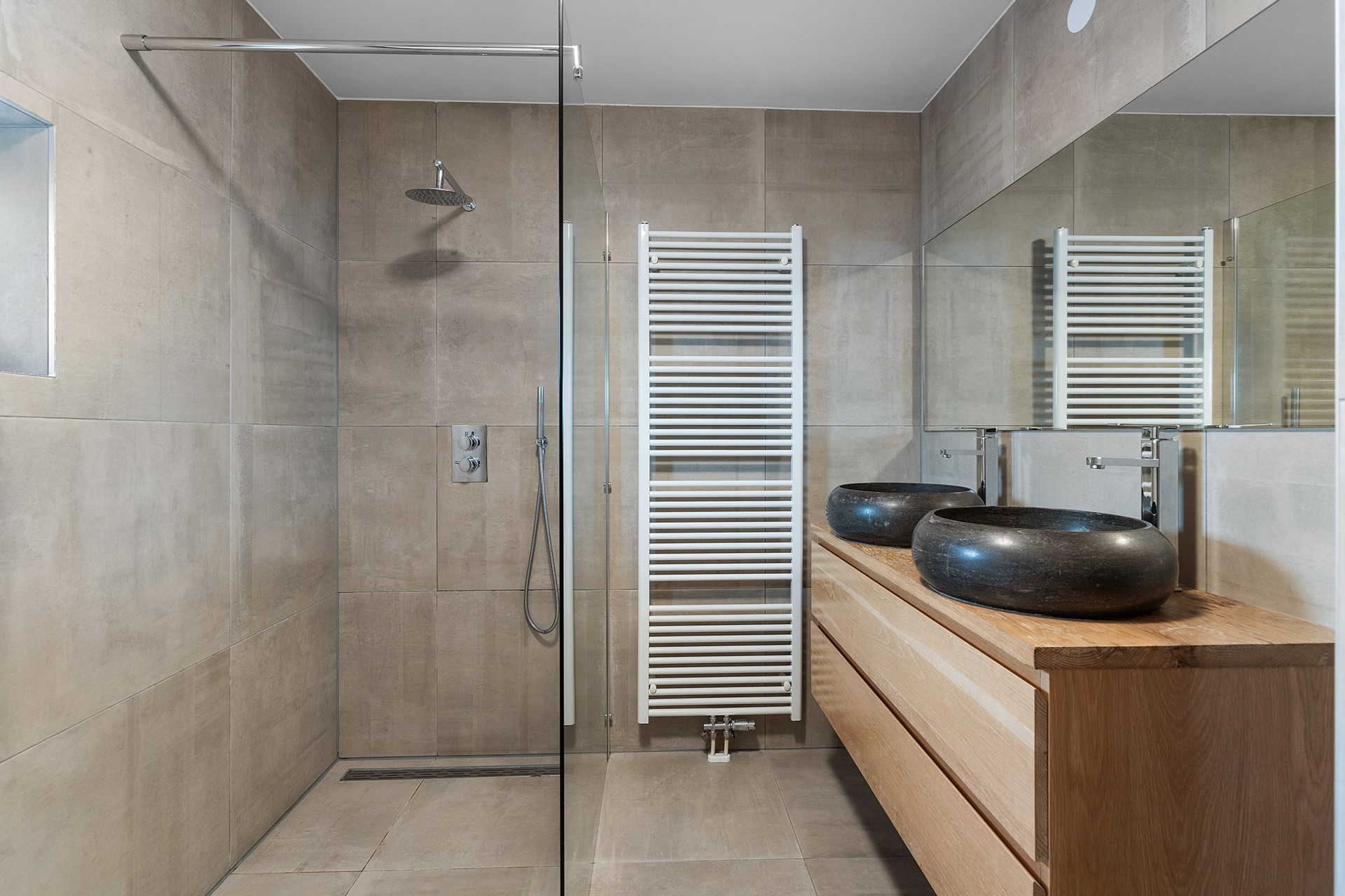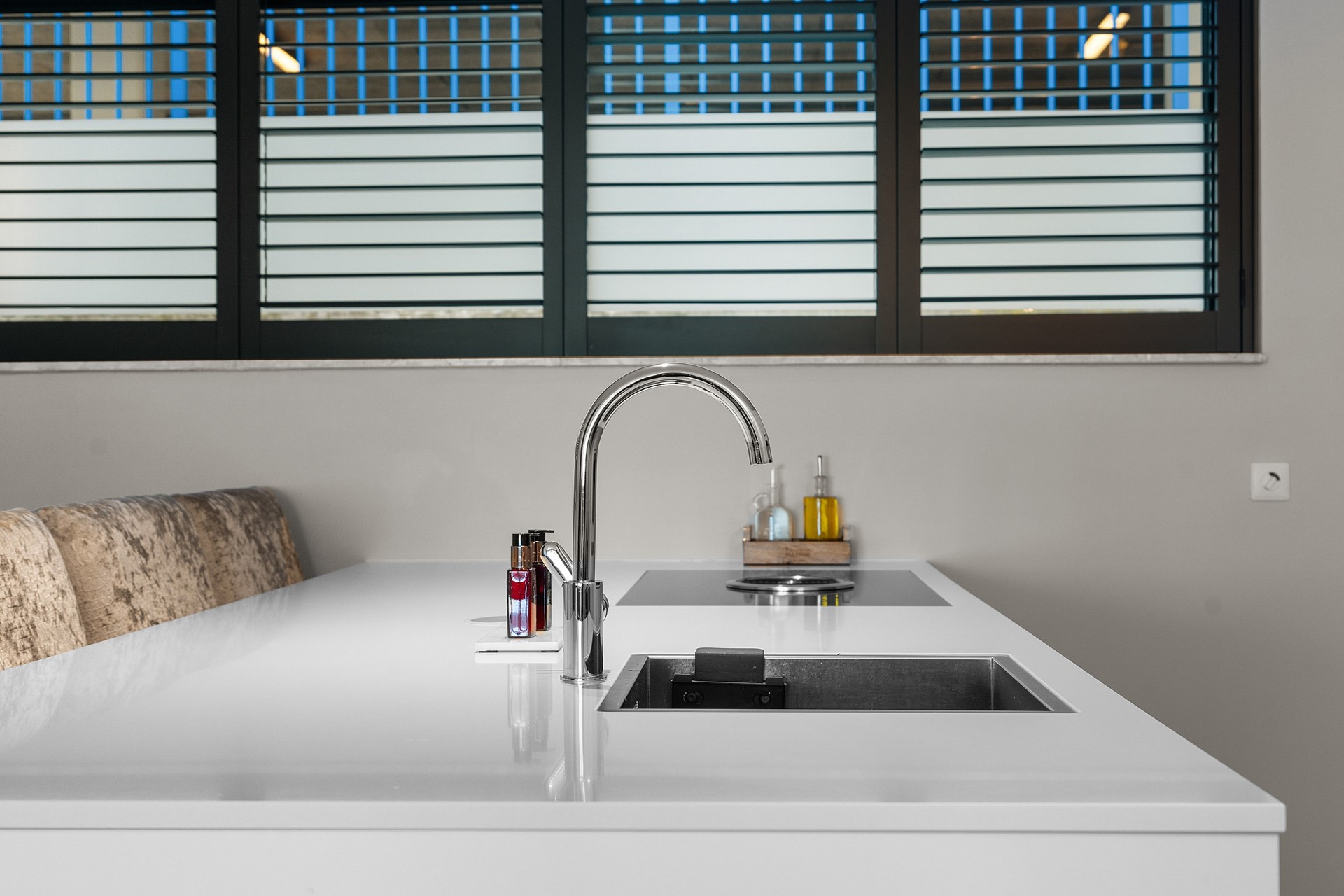 Entree, hal met modern wandcloset en fonteintje. Ruime woonkamer met grote ramen en veel lichtinval, voorzien van stijlvolle shutters. Open keuken (2019) in moderne opstelling, uitgerust met luxe inbouwapparatuur.