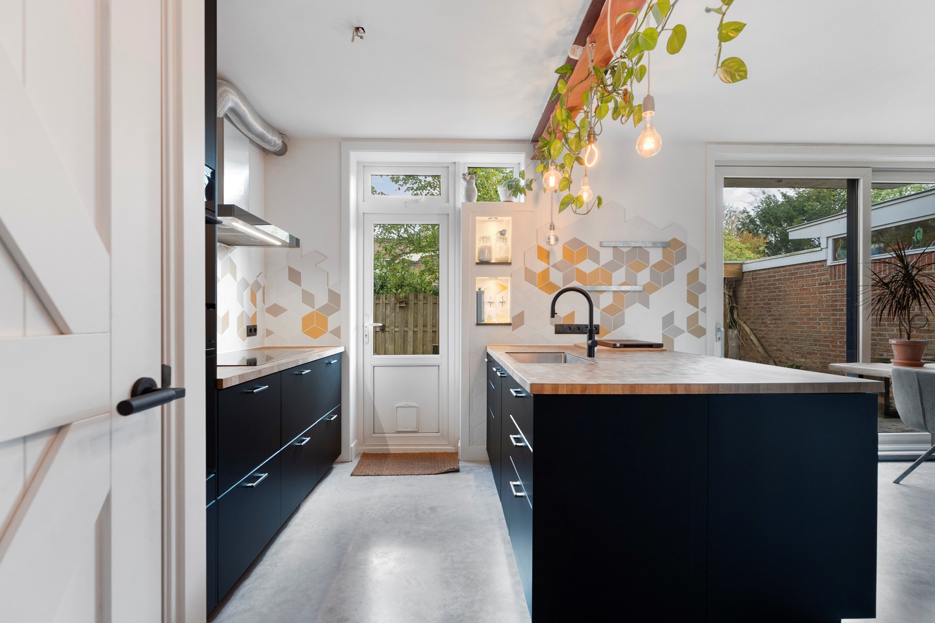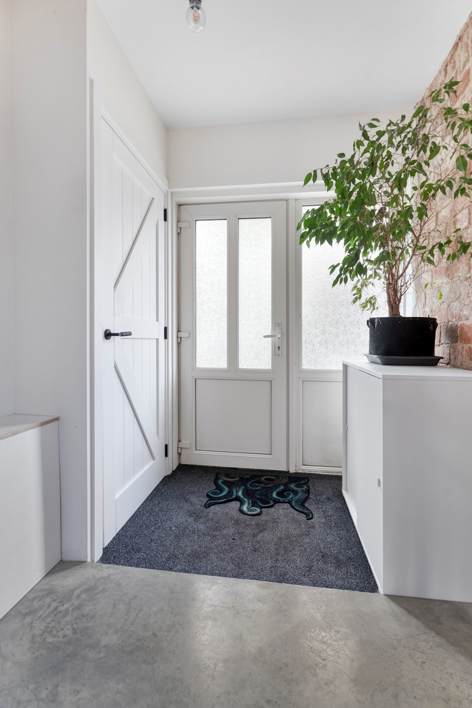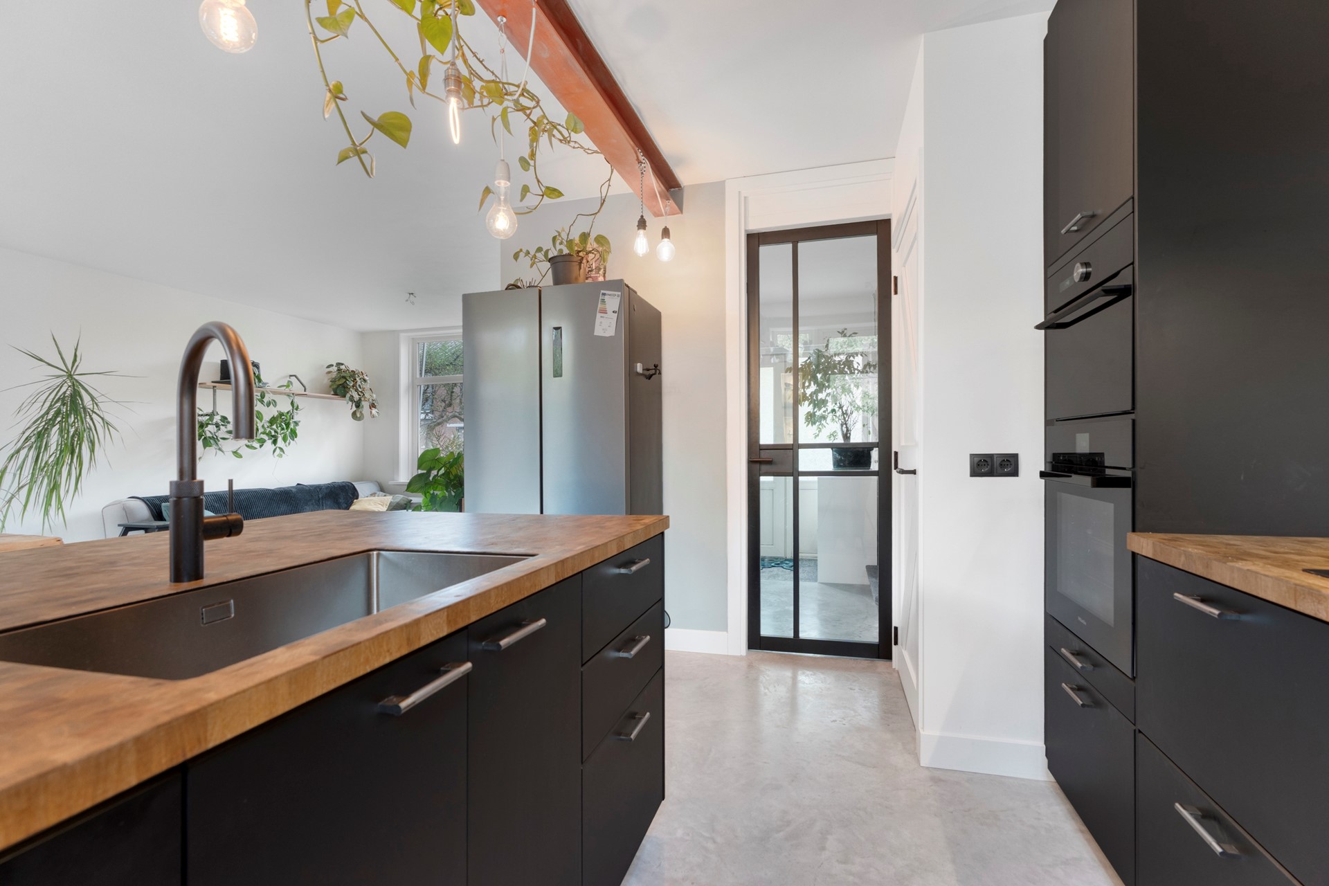 Via de entree komt u in de ruime hal met garderobe, meterkast en toiletruimte. Vanuit hier bereikt u de open keuken met praktische provisiekelder. De keuken is in 2025 volledig vernieuwd en uitgevoerd in een moderne stijl, voorzien van diverse inbouwapparatuur en een quooker, een heerlijke plek voor kookliefhebbers.