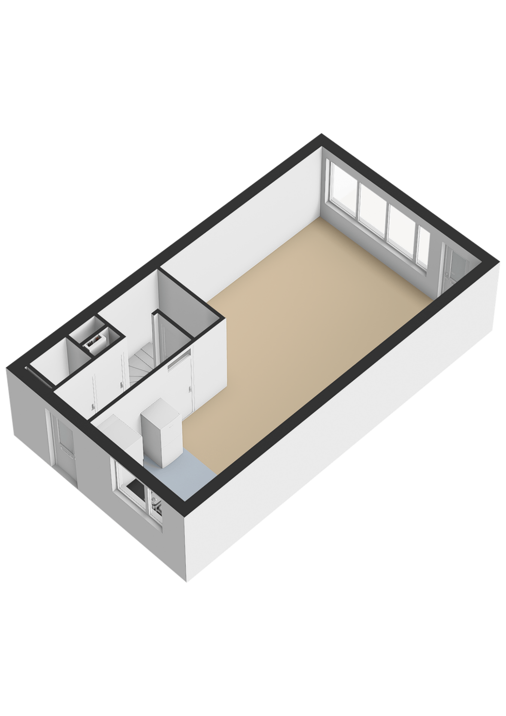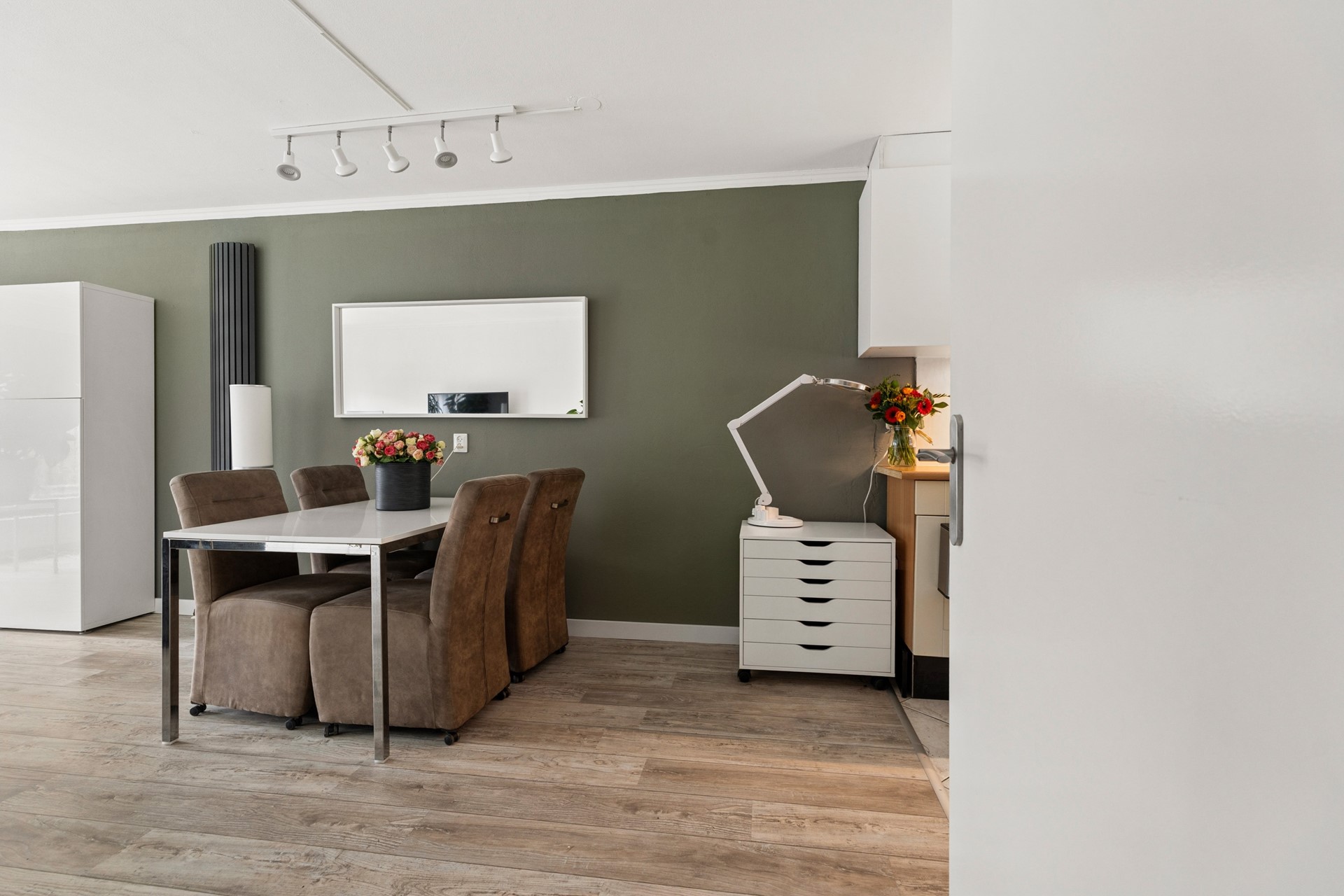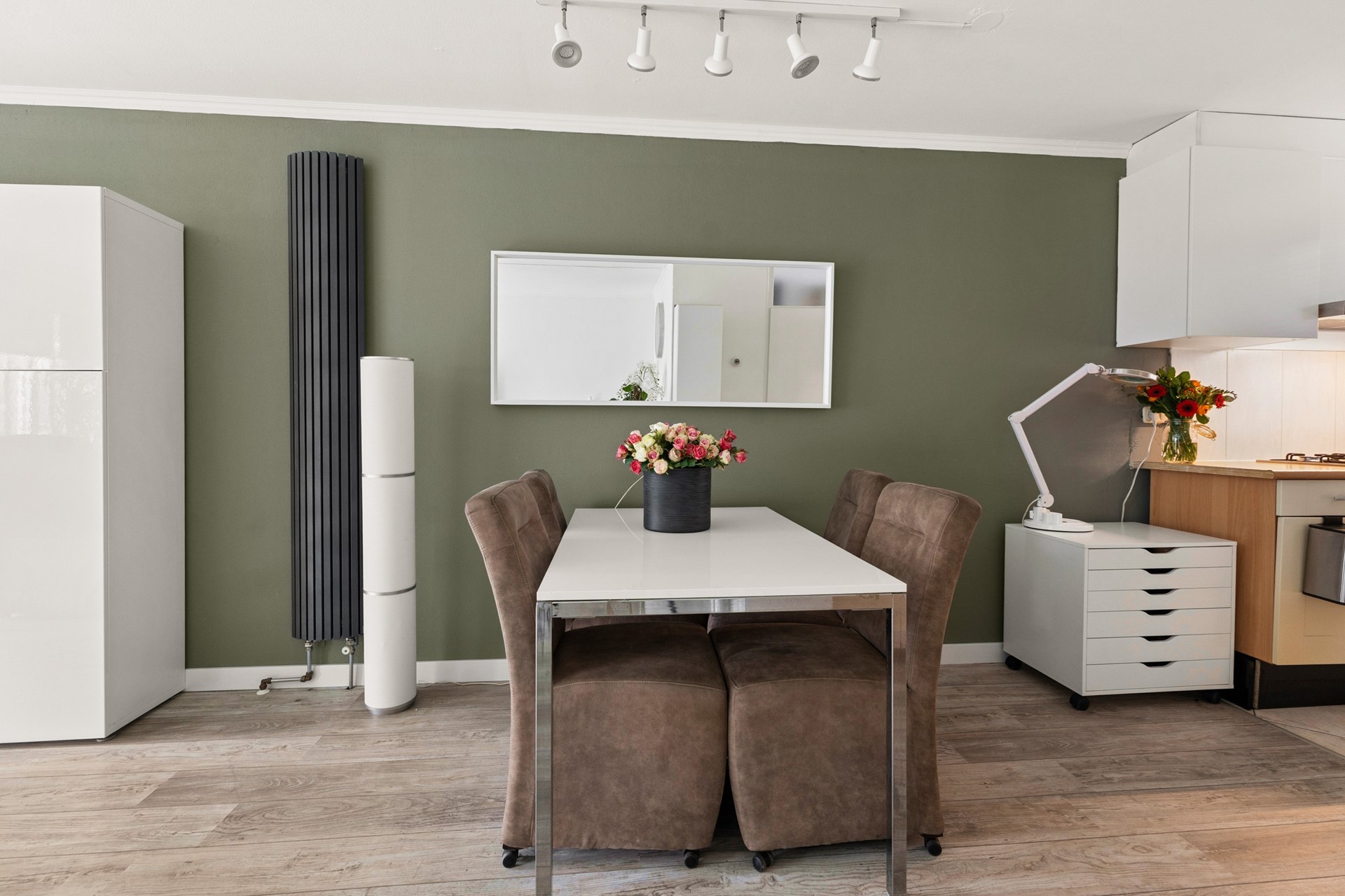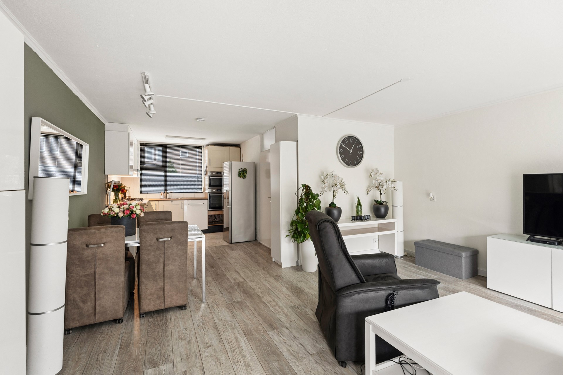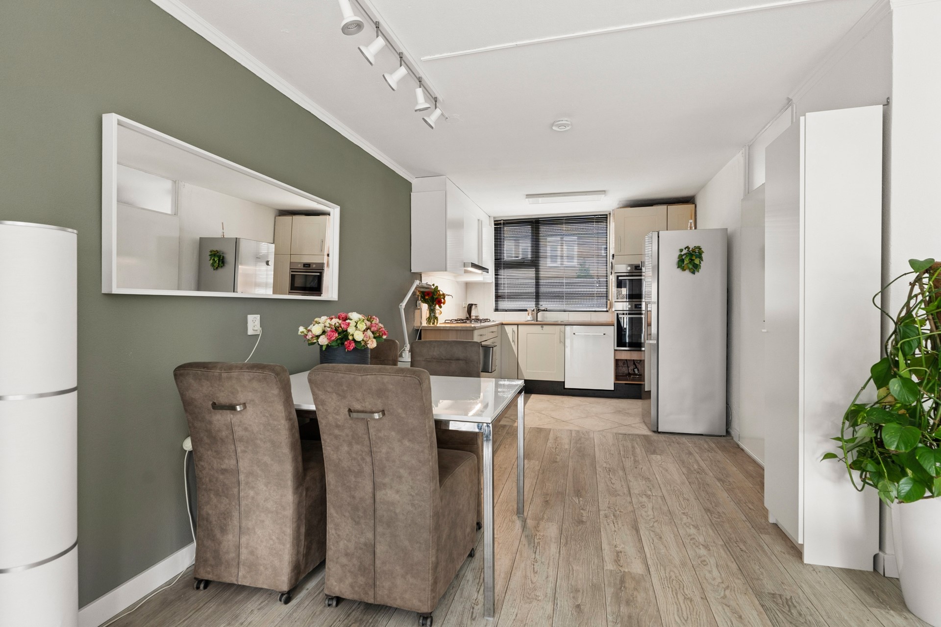 Aan de voorzijde van de woning bevindt zich de open keuken met inbouwapparatuur en biedt uitzicht op de straat. De keuken staat in directe verbinding met de woonkamer.
