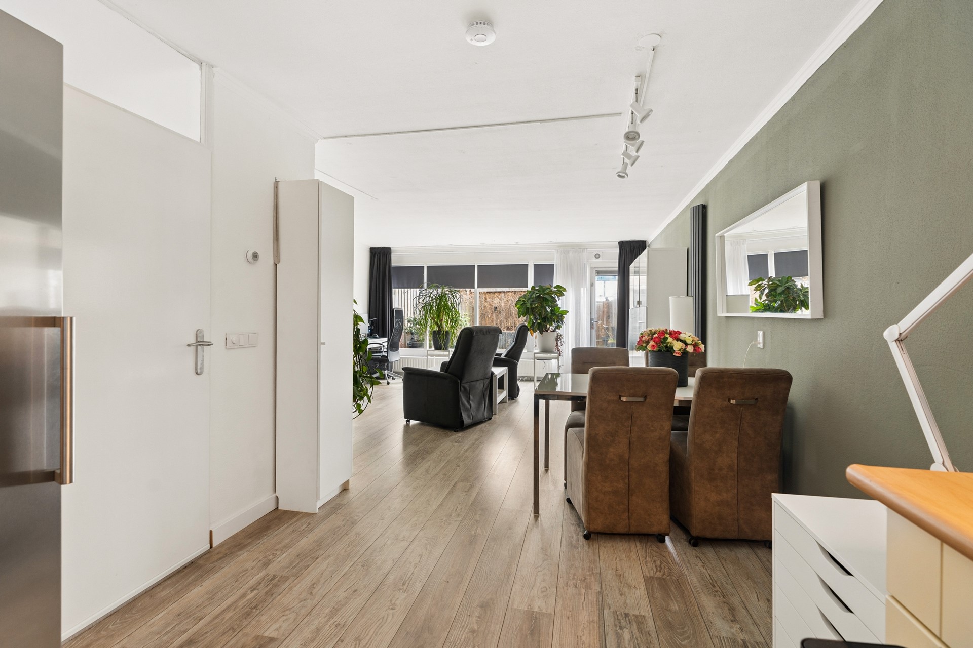 Entree, hal met meterkast en toilet. Vanuit de hal bereik je de lichte en uitgebouwde woonkamer. Dankzij de uitbouw en grote raampartijen is hier een ruime en prettige leefruimte ontstaan met veel daglicht.